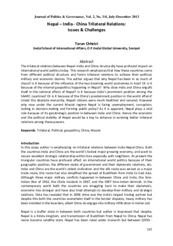 The trilateral relations between Nepal–India and China structurally have profound impact on international world politics today. This research emphasizes that how these countries come from different political structure and forms trilateral relations to achieve their political, military and economic desires. The author argues that why Nepal has been in so much of chaos? Is it because of the influence of the two booming world economies in Asia? Or is it because of the internal geopolitics happening in Nepal? Why dose India and China engulfs itself in the national affairs of Nepal? Is it because India's prominent position among the SAARC countries? Or is it because of the China's predominant position in the world affairs? Under the absolute monarchy, Nepali citizens were much healthier and secured. However why now under the current Maoist regime Nepal is facing unemployment, corruption, lacking in decision-making and forming public policy? As it is apparent, Nepal plays a vital role because of its geostrategic position in-between India and China. Hence the economic and the political stability of Nepal would be a key to enhance in evolving better trilateral relations among these powers.