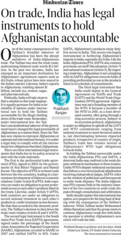 Ranjan, Prabhash (2021) On trade, India has legal instruments to hold Afghanistan accountable. The Hindustan Times.