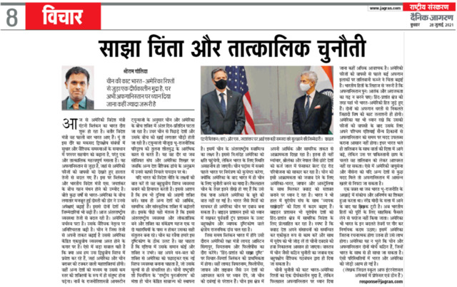 Chaulia, Sreeram (2021) Common concern and immediate challenge: China's cut is an issue related to India-US, but now it is more important to focus on Afghanistan. Dainik Jagran.