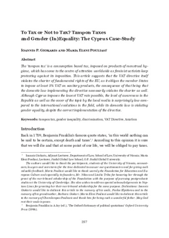 Giokaris, Ioannis P and Pouliasi, Maria Eleni (2020) To tax or not to tax? tampon taxes and gender (in)equality: The cyprus case-study. Cyprus Review, 32 (1). pp. 257-278. ISSN 10152881