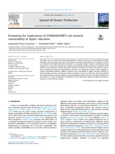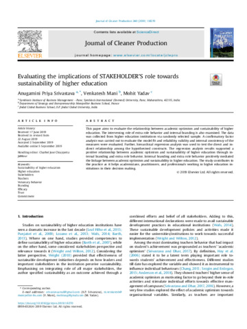 Srivastava, Anugamini Priya, Mani, Venkatesh and Yadav, Mohit (2019) Evaluating the implications of stakeholder's role towards sustainability of higher education. Journal of Cleaner Production, 240: 118270. ISSN 09596526