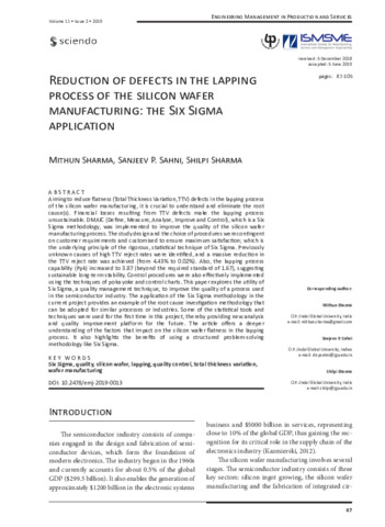 Sharma, Mithun, Sahni, Sanjeev P. and Sharma, Shilpi (2019) Reduction of defects in the lapping process of the silicon wafer manufacturing: the six sigma application. Engineering Management in Production and Services, 11 (2). pp. 87-105. ISSN 25436597