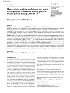 Verma, Shankey and Mishra, Aditi (2020) Depression, anxiety, and stress and socio-demographic correlates among general Indian public during COVID-19. International Journal of Social Psychiatry, 66 (8). pp. 756-762. ISSN 207640