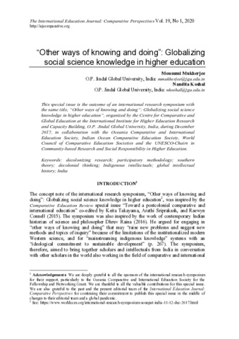 This special issue is the outcome of an international research symposium with the same title: “Other ways of knowing and doing": Globalizing social science knowledge in higher education, organized by the Centre for Comparative and Global Education at the International Institute for Higher Education Research and Capacity Building, O.P. Jindal Global University, India, during December 2017, in collaboration with the Oceania Comparative and International Education Society (OCIES), Indian Ocean Comparative Education Society, World Council of Comparative Education Societies and the UNESCO-Chairs in Community-based Research and Social Responsibility in Higher Education. The seminar and this publication were supported through an OCIES Fellowships and Networking Grant.