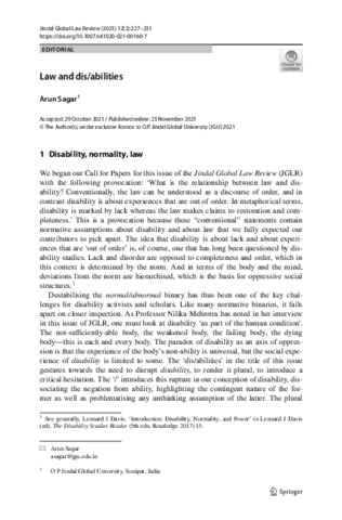 Sagar, Arun (2021) Law and dis/abilities. Jindal Global Law Review, 12 (2). pp. 227-231. ISSN 9752498