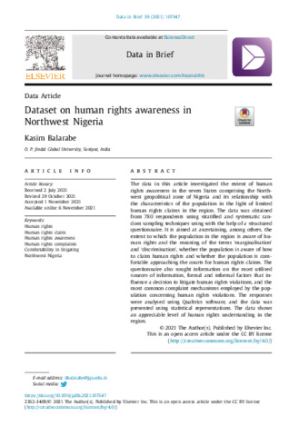 Balarabe, Kasim (2021) Dataset on human rights awareness in Northwest Nigeria. Data in brief, 39: 107547. ISSN 23523409