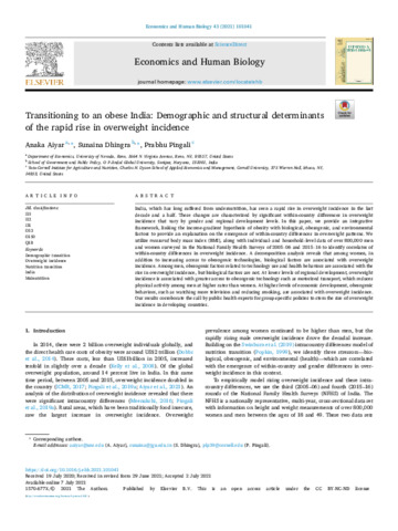 Aiyar, Anaka, Dhingra, Sunaina and Pingali, Prabhu (2021) Transitioning to an obese India: Demographic and structural determinants of the rapid rise in overweight incidence. Economics and Human Biology, 43: 101041. pp. 1-21. ISSN 1570677X