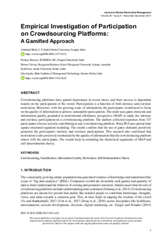 Behl, Abhishek, Sheorey, Pratima, Chavan, Meena, Jain, Kokil and Jajodia, Isha (2021) Empirical investigation of participation on crowdsourcing platforms: A gamified approach. Journal of Global Information Management, 29 (6). pp. 1-27. ISSN 10627375