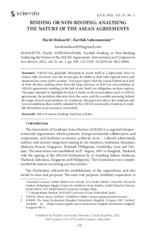 Mahaseth, Harsh and Subramaniam, Karthik (2021) Binding or non-binding: analysing the nature of the Asean agreements. International and Comparative Law Review, 21 (1). pp. 100-123. ISSN 12138770