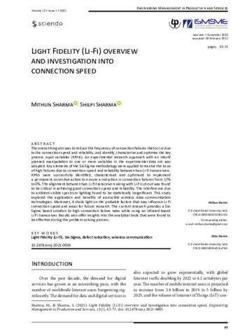 Sharma, Mithun and Sharma, Shilpi (2021) Light Fidelity (Li-Fi) overview and investigation into connection speed. Engineering Management in Production and Services, 13 (1). pp. 63-73. ISSN 25436597