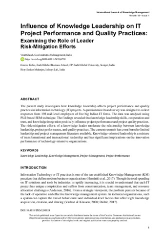 Ghosh, Vinit, Kabra, Gaurav and Mukerjee, Hory Sankar (2022) Influence of knowledge leadership on it project performance and quality practices: examining the role of leader risk-mitigation efforts. International Journal of Knowledge Management, 18 (1). ISSN 15480666