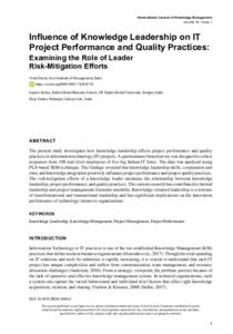 The present study investigates how knowledge leadership affects project performance and quality practices in information technology (IT) projects. A questionnaire-based survey was designed to collect responses from 198 mid-level employees of five big Indian IT firms. The data was analysed using PLS-based SEM technique. The findings revealed that knowledge leadership skills, cooperation and trust, and knowledge integration positively influence project performance and project quality practices. The risk-mitigation efforts of a knowledge leader moderate the relationship between knowledge leadership, project performance, and quality practices. The current research has contributed to limited leadership and project management literature available. Knowledge-oriented leadership is a mixture of transformational and transactional leadership and has significant implications on the innovation performance of technology-intensive organizations