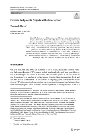 Gayoye, Martha, Hunter, Mateenah, Manji, Ambreena, Matinda, Miriam, Sekalala, Sharifah, Chaudhary, Rachna, Lammasniemi, Laura, Munoth, Shreya, Prabhat, Devyani, Sen, Jhuma, Black, Gillian, Cowan, Sharon, Kennedy, Chloe and Munro, Vanessa E. (2021) Feminist Judgments Projects at the Intersection. Feminist Legal Studies, 29. pp. 251-261. ISSN 09663622