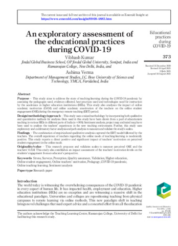 Kumar, Vibhash and Verma, Ashima (2021) An exploratory assessment of the educational practices during COVID-19. Quality Assurance in Education, 29 (4). pp. 373-392. ISSN 9684883