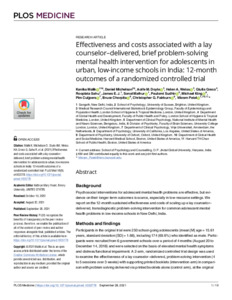Malik, Kanika, Michelson, Daniel, Aoife M. Doyle, Aoife M., Weiss, Helen A., Greco, Giulia, Sahu, Rooplata, E. J., James, Mathur, Sonal, Sudhir, Paulomi, King, Michael, Cuijpers, Pim, Chorpita, Bruce, Fairburn, Christopher G. and Patel, Vikram (2021) Effectiveness and costs associated with a lay counselor–delivered, brief problem-solving mental health intervention for adolescents in urban, low-income schools in India: 12-month outcomes of a randomized controlled trial. PLoS Medicine, 18 (9): e1003778. pp. 1-19. ISSN 15491277