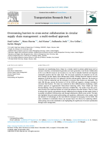 Luthra, Sunil, Sharma, Manu, Kumar, Anil, Joshi, Sudhanshu, Collins, Eva and Mangla, Sachin Kumar (2022) Overcoming barriers to cross-sector collaboration in circular supply chain management: a multi-method approach. Transportation Research Part E: Logistics and Transportation Review, 157 (102582). ISSN 13665545