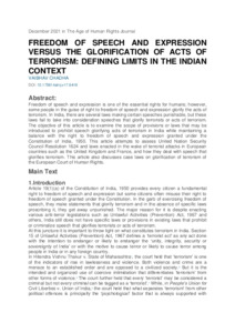 Freedom of speech and expression is one of the essential rights for humans; however, some people in the guise of right to freedom of speech and expression glorify the acts of terrorism. In India, there are several laws making certain speeches punishable, but these laws fail to take into consideration speeches that glorify terrorists or acts of terrorism. The objective of this article is to examine the scope of provisions or laws that may be introduced to prohibit speech glorifying acts of terrorism in India while maintaining a balance with the right to freedom of speech and expression granted under the Constitution of India, 1950. This article attempts to assess United Nation Security Council Resolution 1624 and laws enacted in the wake of terrorist attacks in European countries such as the United Kingdom and France, and how they deal with speech that glorifies terrorism. This article also discusses case laws on glorification of terrorism of the European Court of Human Rights.