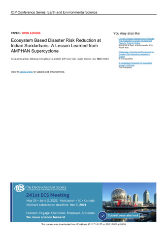Chowdhury, Abhiroop, Naz, Aliya, Iyer, Aparna Shankar and Bhattacharyya, Santanu (2021) Ecosystem based disaster risk reduction at Indian Sundarbans: A lesson learned from AMPHAN supercyclone. In: IOP conference series: Earth and environmental science, volume 796, community based research and innovations in civil engineering, 18-19 March 2021, Jaipur, India.