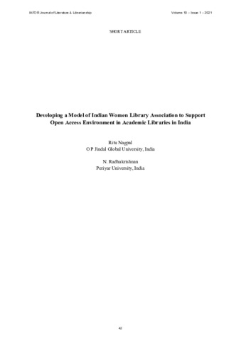 Nagpal, Ritu and Radhakrishnan, N. (2021) Developing a model of indian women library association to support open access environment in academic libraries in India. IAFOR Journal of Literature and Librarianship, 10 (1). pp. 42-48. ISSN 21870608