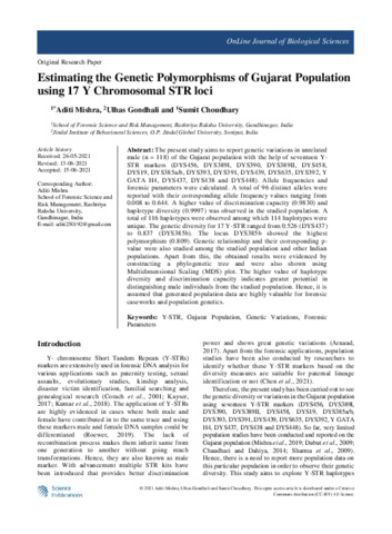 Mishra, Aditi, Gondhali, Ulhas and Choudhary, Sumit (2021) Estimating the genetic polymorphisms of gujarat population using 17 Y chromosomal STR Loci. OnLine Journal of Biological Sciences, 21 (2). pp. 388-394. ISSN 16084217