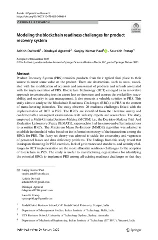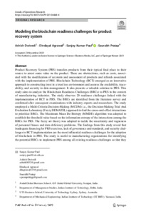 Dwivedi, Ashish, Agrawal, Dindayal, Paul, Sanjoy Kumar and Pratap, Saurabh (2022) Modeling the blockchain readiness challenges for product recovery system. Annals of Operations Research, 327 (01). pp. 493-537. ISSN 02545330