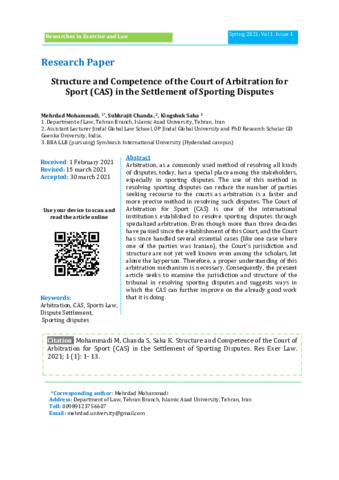 Mohammadi, Mehrdad, Chanda, Subhrajit and Saha, Kingshuk (2021) Structure and competence of the court of arbitration for sport (CAS) in the settlement of sport disputes. Research in Exercise and Law, 1 (1). pp. 1-13.