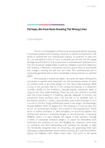 PERHAPS, WE HAVE BEEN DRAWING THE WRONG LINES ...altogether, in understanding the discursive practices that inform architectural pedagogy. In the three decades following the publication of Beatriz Colomina’s Sexuality and Space, architect-educators are not as prone to question the gendering of spaces, through the introduction of (unfortunately) elective seminars on the same. Yet locating questions of sex, gender and subsequently identity, within the discipline remains largely ignored. We ran, before we could walk. In finding (our own) identities, we have misidentified the problem: that of representation. In particular, architectural representation in the form of orthographic drawings, which underpin most, if not all forms of architectural production, producing architects first and foremost, given that they essentially make drawings, not buildings as Robin Evans argues. Furthermore, these works are necessarily predicated on both distancing and aperspectivity, in their putative objectivity. Yet, work that looks at the ontology of drawings is few and far in between. Extending this, I posit that to understand the possibility of a feminist pedagogy within architecture, we need to return to the literal and metaphorical drawing board. If as Judith Butler argues, both gender and sex are constantly performed through acting upon matter , it is architects acting on and through the (matter of) drawings, that gendering takes place. Furthermore, what do these supposedly objective acts/objects implicitly teach us? Acts of complete control, afforded only through the making of orthographic representations. As I will argue in the paper that follows, it is thus, that the biological-sex of the architect is rendered irrelevant, in lieu of their gendered subjectivity, which predicated on control, is pervasively and dominantly masculine. We drew, before we could talk. What happens if we destabilize the myth about the omnipresence and omnipotence of architectural representation, and consequently of the masculine architectural genius? Through a series of experiments at JSAA , we immersively focus on the representations within which we are always already embedded. What if we investigate not designate, collect in lieu of create, analyze instead of design, and visually narrate, as opposed to dictate? Could we, then, raise questions about the act and object/ives of architectural representations, through larger representational practices, wherein the world was understood as always already complex, and not conveniently reductive? Could we raise the question of intersectionalities, as opposed to simplistic linearities immanent to architectural representations? Through this, could we allow for a feminist architectural pedagogy from within, instead of without? These are some of the avenues, which the proposed paper, hopes to open up for discussion.