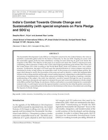 Mann, Deepika, -, Arjun and Lamba, Jasmeet Kaur (2021) India’s combat towards climate change and sustainability (with special emphasis on Paris pledge and SDG’s). Ecology, Environment and Conservation, 27. pp. S67-S74. ISSN 0971765X